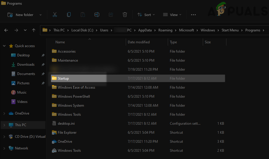 - Proceed to the Programs directory, then double-click the Startup folder.