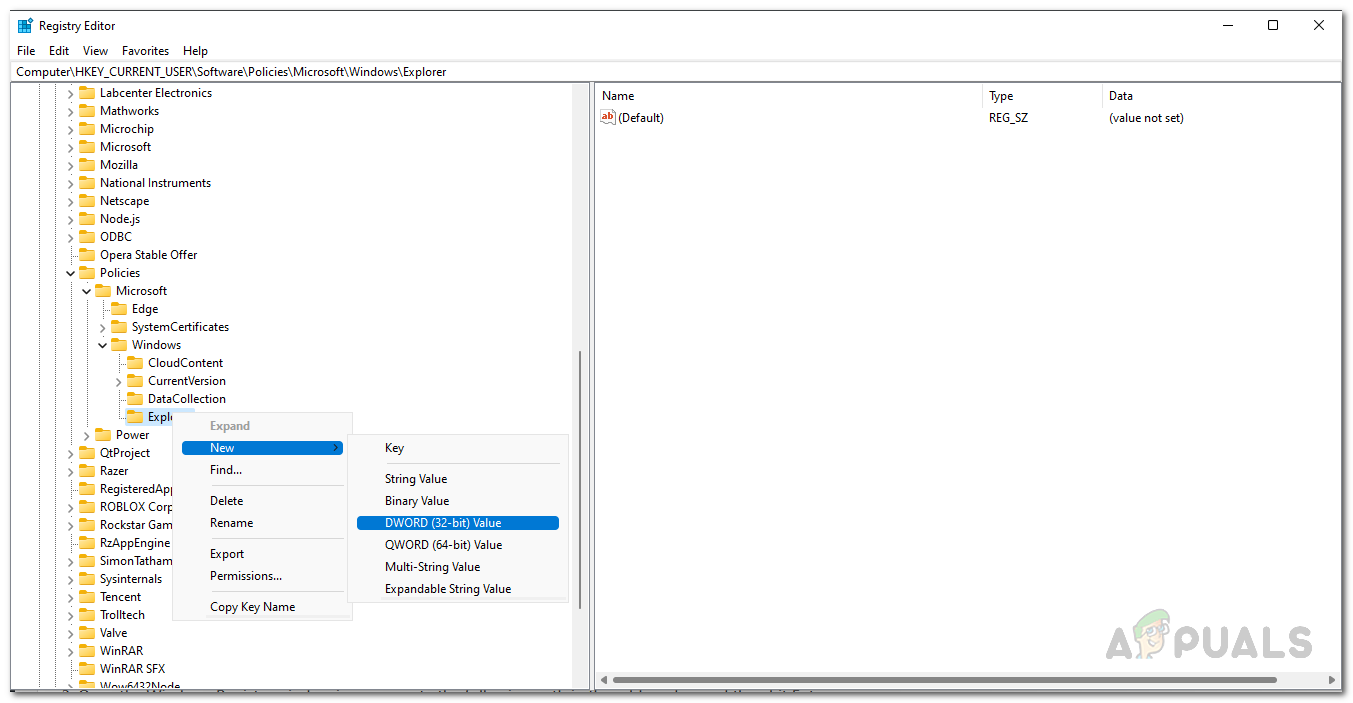 Renaming the New Key - Right-click the Explorer key, then select New > DWORD (32-bit) Value.