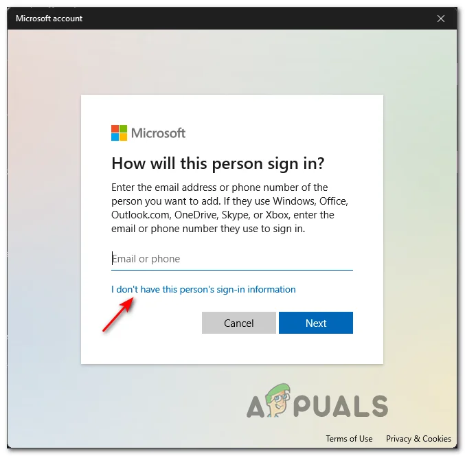 Adding New User Account - A window titled “Microsoft account” will appear. Click I don’t have this person’s sign-in information.