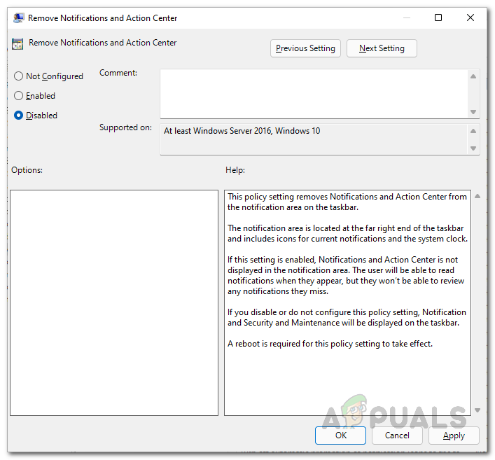 Editing Remove Notifications and Action Center Policy - Restart your computer for the changes to take effect.