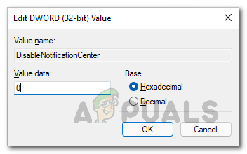 Renaming the New Key - Double-click DisableNotificationCenter and set the value to 0. Click OK.