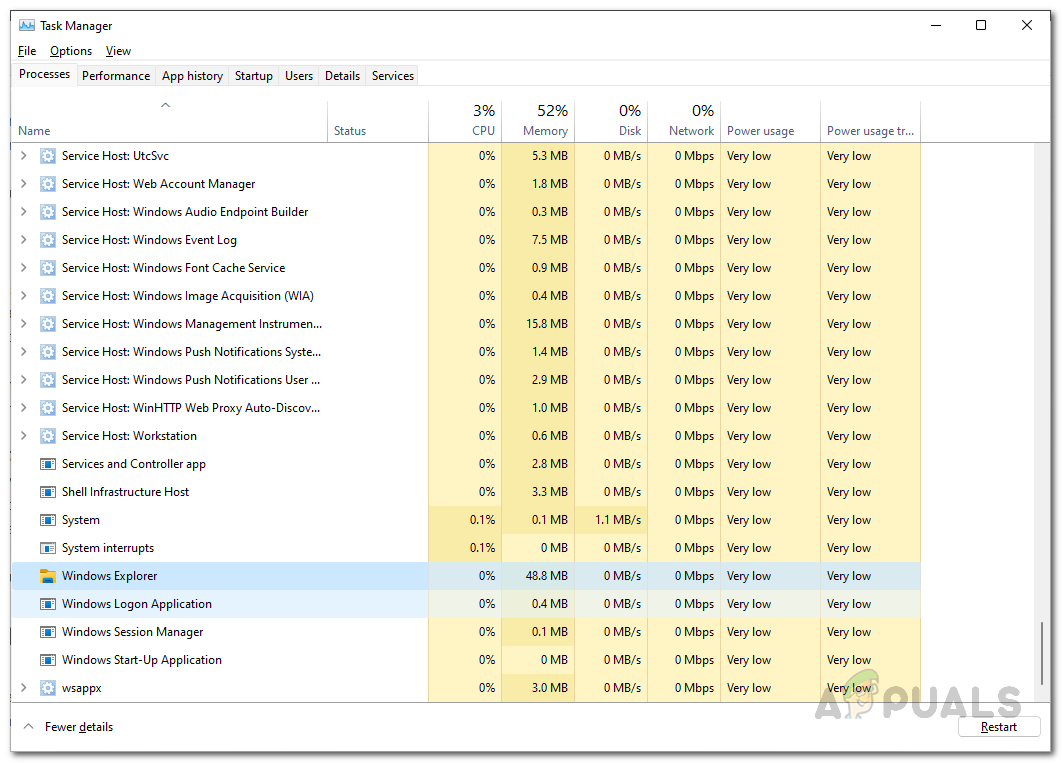 Opening up Task Manager - In Task Manager, find the Windows Explorer process under the Processes tab.