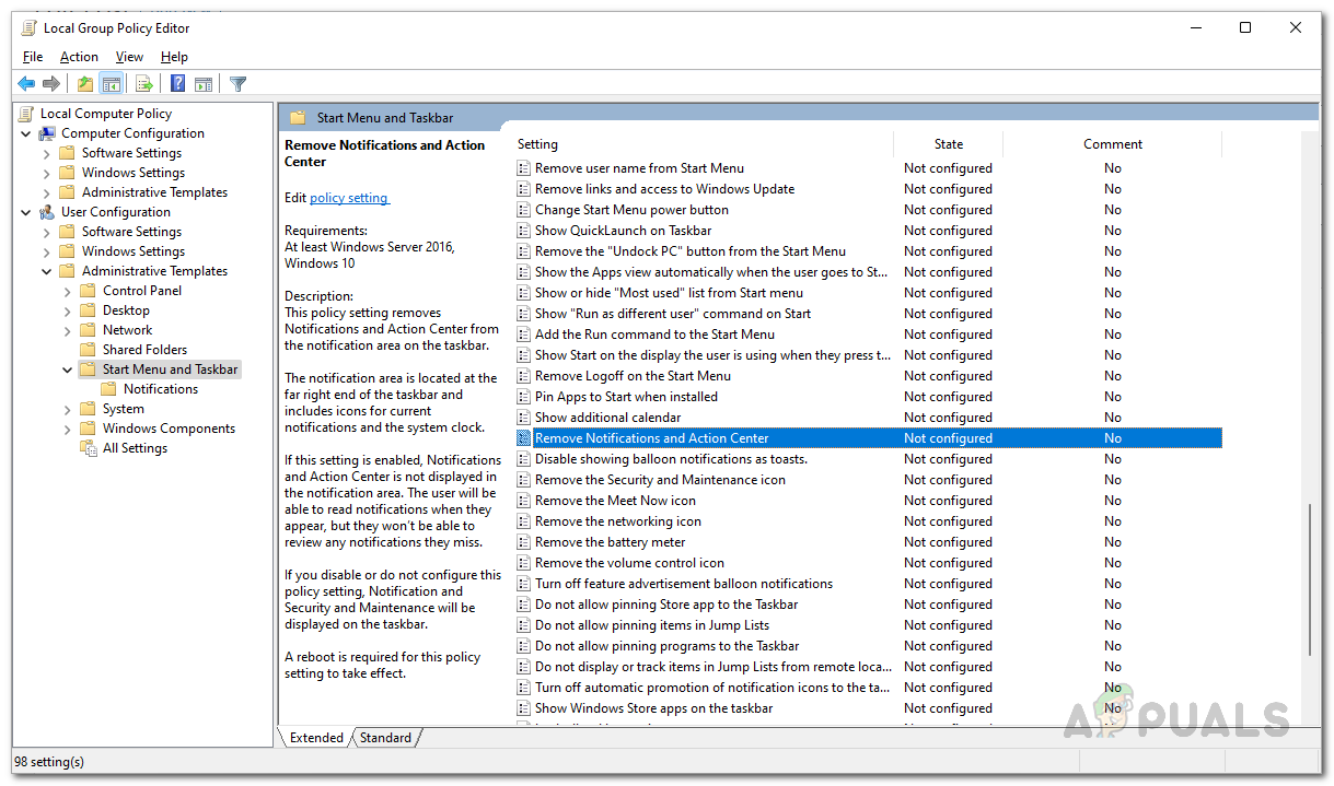 - On the right side, find the policy named Remove Notifications and Action Center.