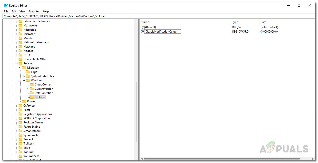 Creating Explorer Key - Name the value DisableNotificationCenter.