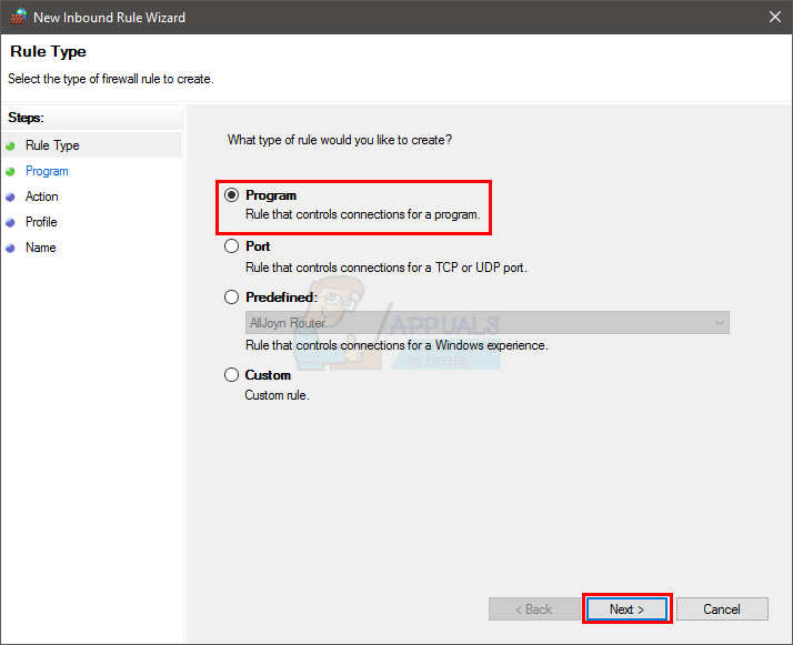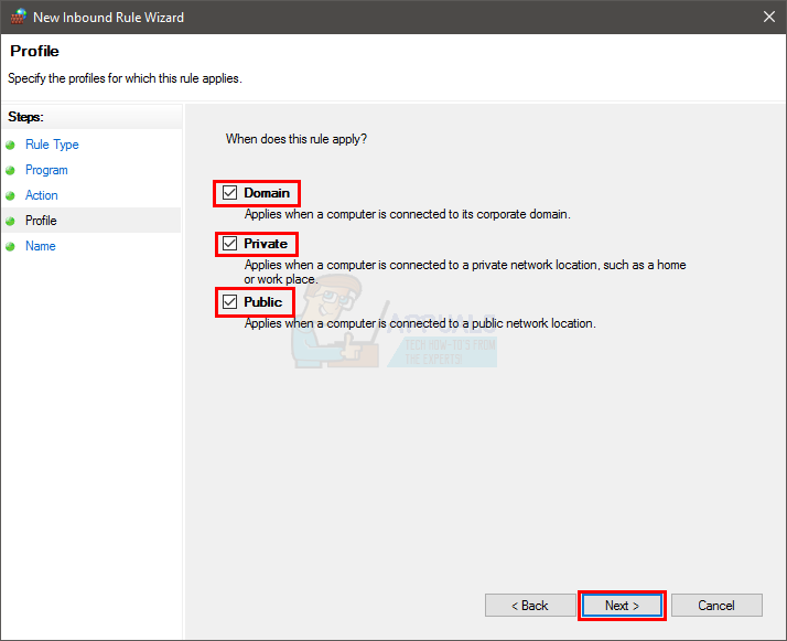 - Check all boxes (Domain, Private, and Public) and click Next.