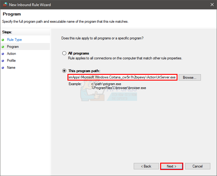- Enter: %SystemRoot%\SystemApps\Microsoft.Windows.Cortana_cw5n1h2txyewy\ActionUriServer.exe. You can also click Browse and navigate to C Drive > Windows > SystemApps > Microsoft.Windows.Cortana_cw5n1h2txyewy > ActionUriServer.exe.