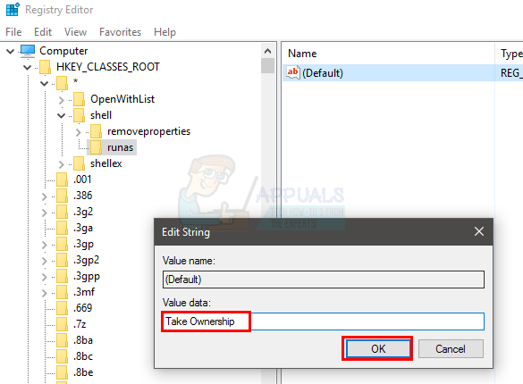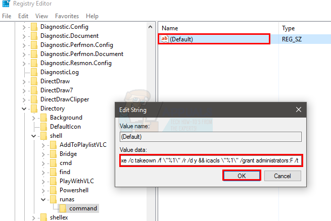 - Create a command key under runas, and in its default value type cmd.exe /c takeown /f “%1” /r /d y && icacls “%1” /grant administrators:F /t.