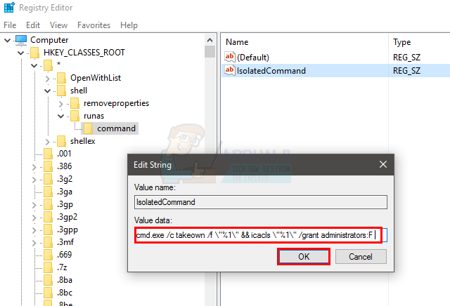 - Add an IsolatedCommand string value and type cmd.exe /c takeown /f “%1” /r /d y && icacls “%1” /grant administrators:F /t.