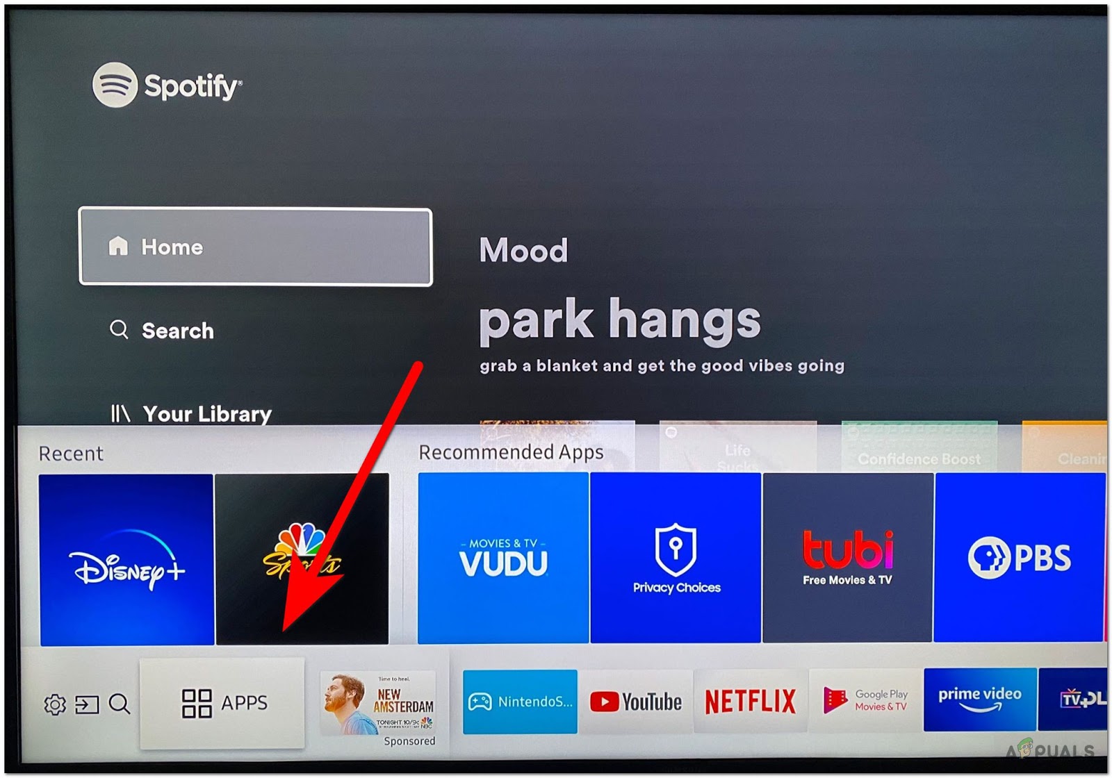 Accessing the Apps section on Samsung Smart TV - An activation code will appear on your TV screen. Write this code down.