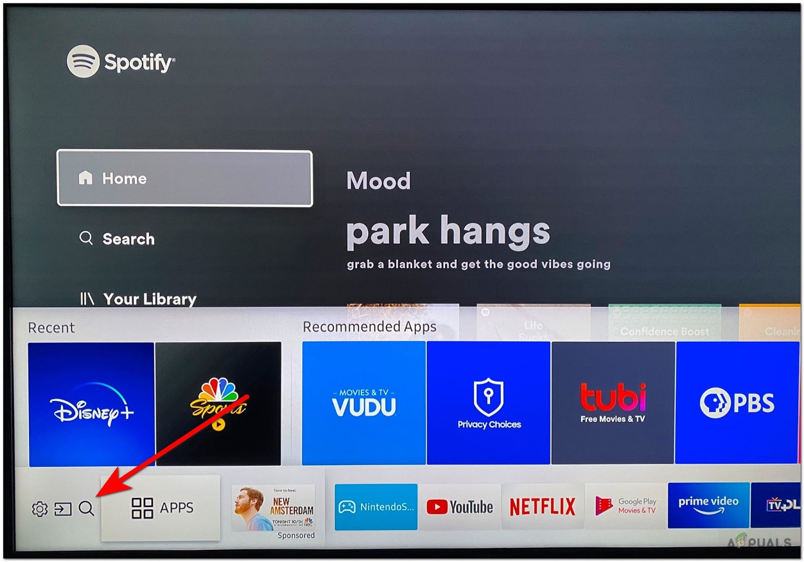 Accessing the Home screen on Samsung Remote - Go to the Apps section at the bottom left of the screen and open the search box.