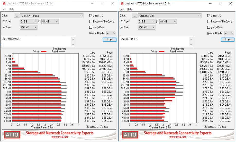 However, in some niche theoretical scenarios, some changes might be observed in the raw numbers. For example, ServeTheHome and Tom’s Hardware compared the performance of the older and newer variants of the drives in ATTO, a popular storage benchmark. The numbers of the older drive (on the left) are significantly higher than those of the newer drive (on the right).