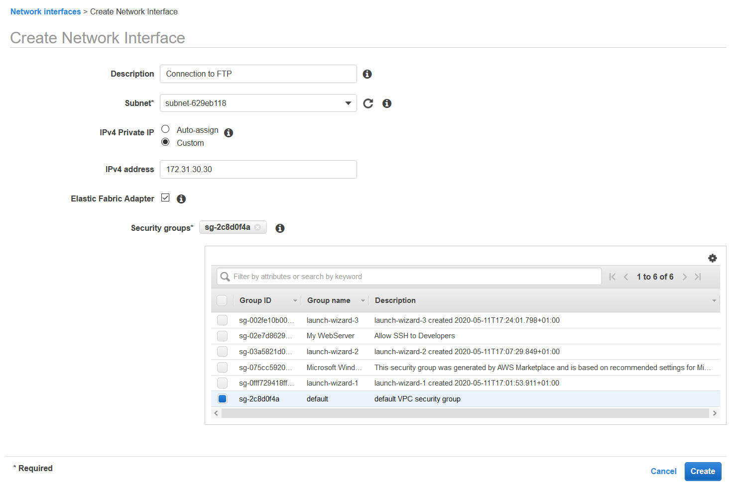 - Elastic Fabric Adapter – An Elastic Fabric Adapter can boost performance for high-performance computing and machine learning workloads. For most cases, including ours, you can leave this option disabled.