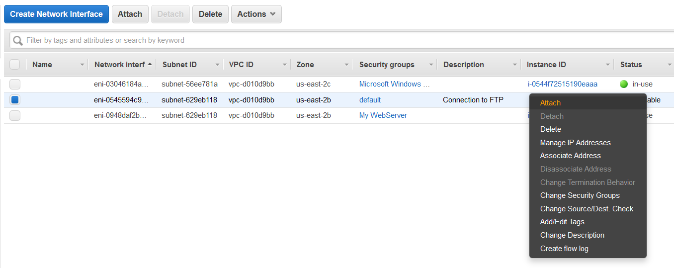- Select your newly created network interface, right-click it, and choose Attach to assign this network interface to your Amazon EC2 instance.