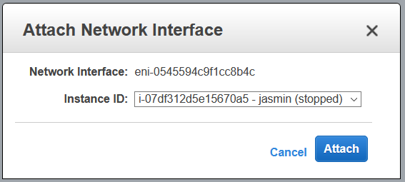 - On the Attach Network Interface window, select your instance ID from the dropdown, and then click Attach.
