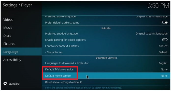 - Back in the Settings directory, click on Default movie service. Select a subtitle service and click OK to save.