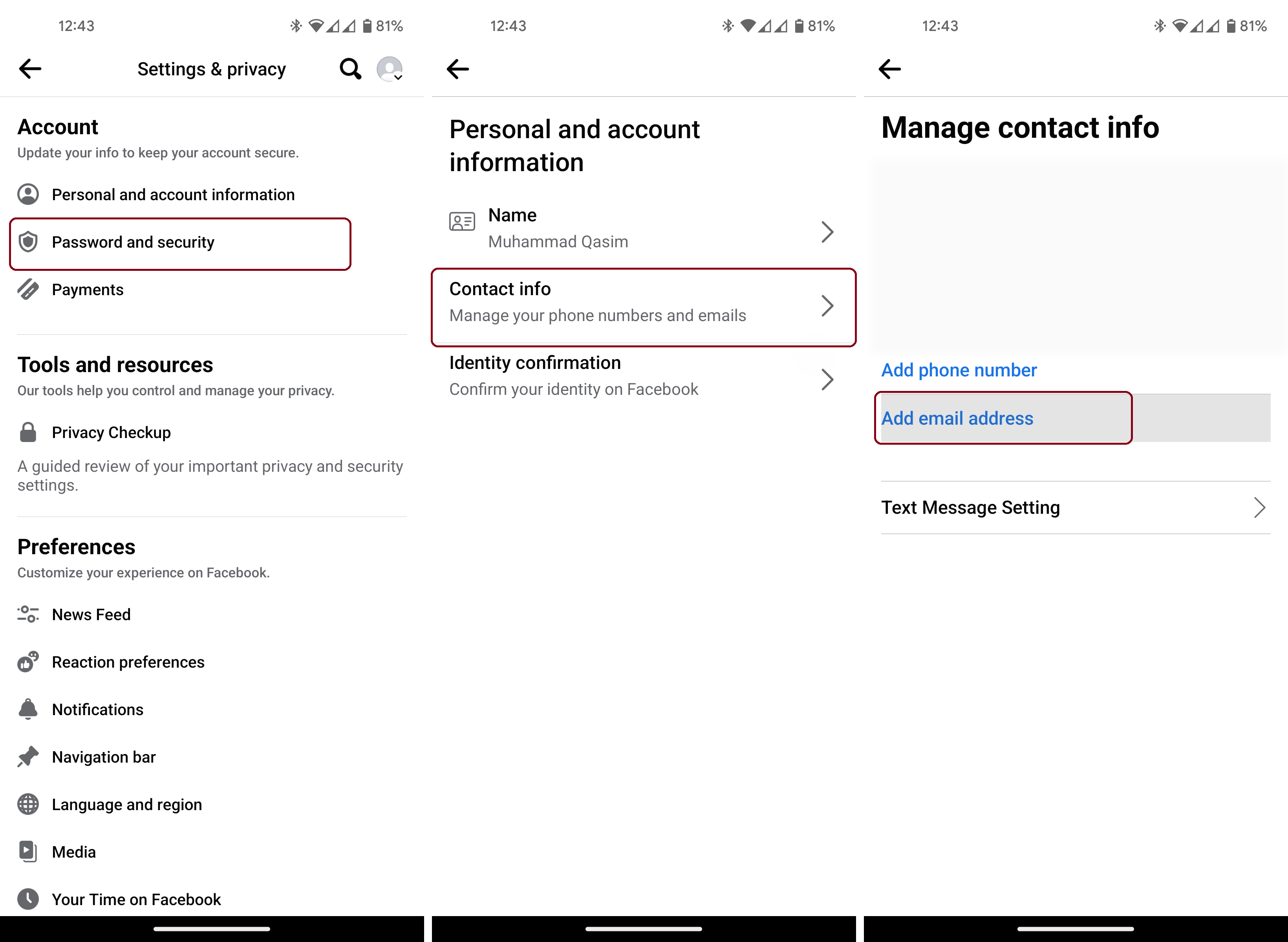 - You’ll see a list of your current contact details. Tap “Add email address“, then enter your new email on the next page.