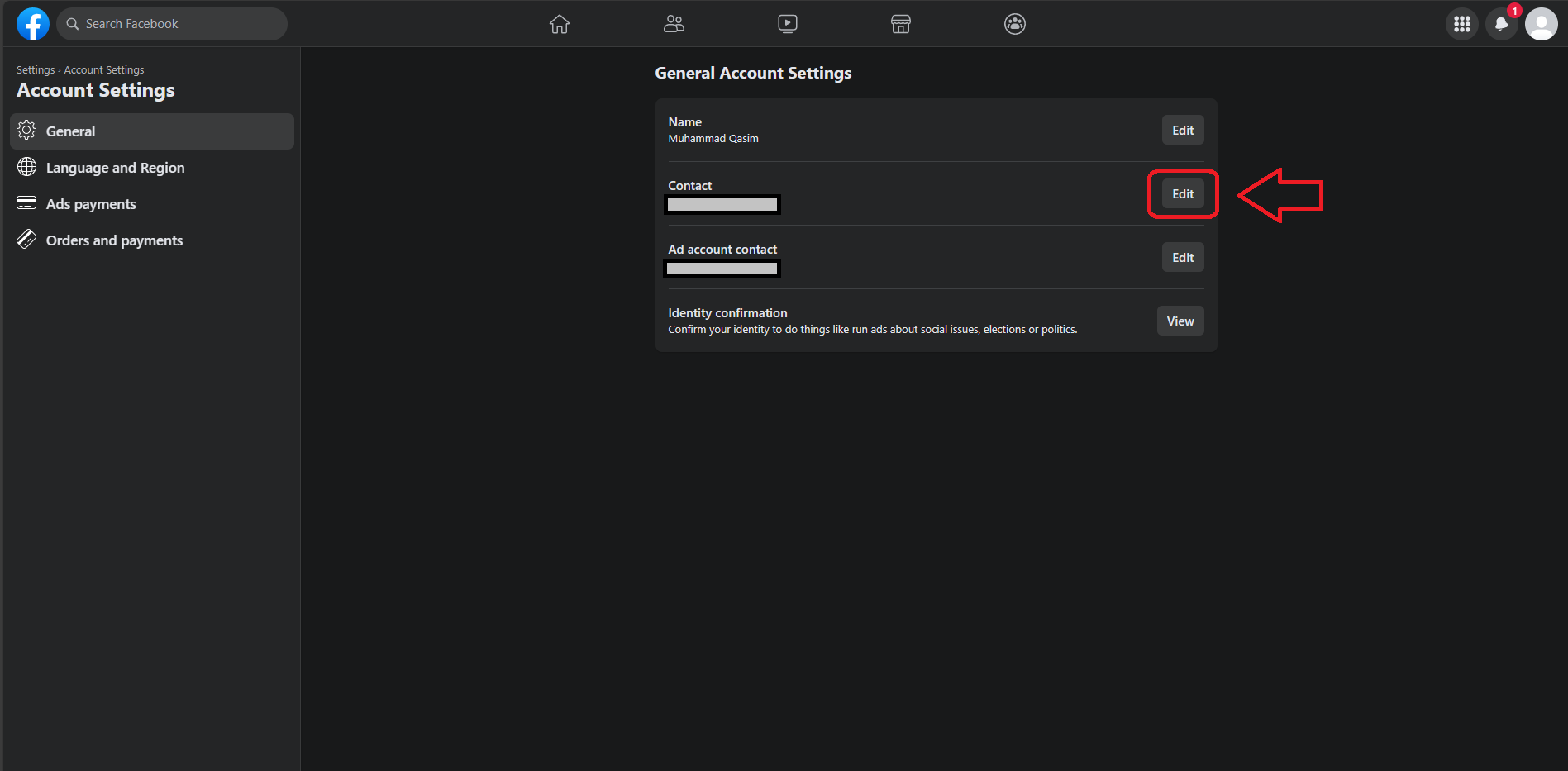 - In the General tab, find the Edit button next to Contact. Click it.