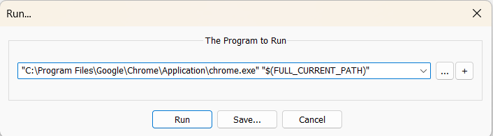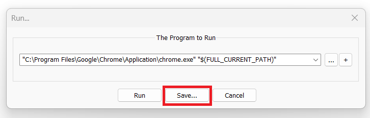- In the Run dialog box, enter the browser’s executable path and add “$(FULL_CURRENT_PATH)” at the end (including the quotation marks). This tells the browser to open the file you currently have active in Notepad++.