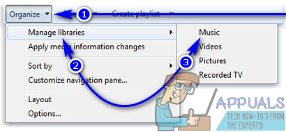 - Hover over Manage libraries, then click on Music in the menu that appears. This will open the Music Library Locations dialog box.