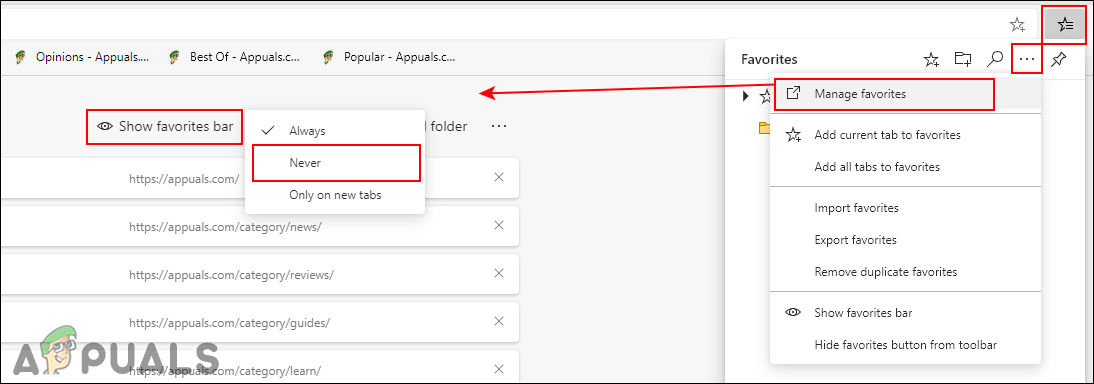 Removing favorites bar - Another option is through the Favorites menu. Click on the Favorites icon on the toolbar, select the More options (three dots), and choose Manage favorites. Then, at the top, find the Show favorites bar menu and set it to Never.