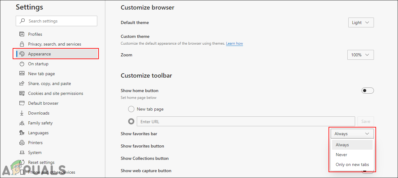 Opening settings - Next, click on Appearance in the left-hand menu, then look for the Show favorites bar option. Set it to Never.