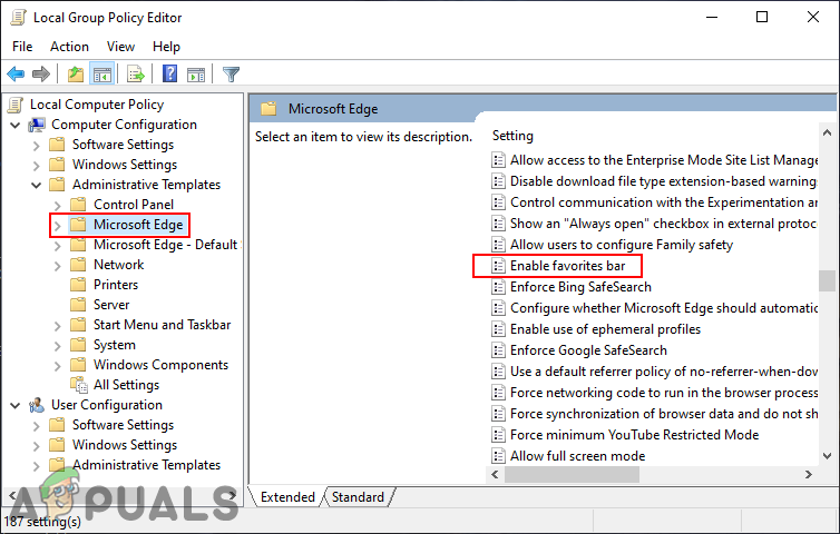 The Group Policy Editor is a Windows tool that allows you to configure important settings on your PC. With this method, you can permanently disable the Favorites bar and prevent other users from enabling it again in Microsoft Edge. Standard users will not be able to turn the Favorites bar back on through browser settings.