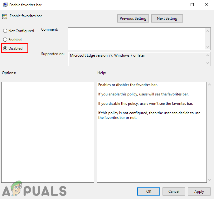 Navigating to the settings - Find the setting called “Enable favorites bar“, then double-click it to open its options. Change the setting from Not Configured to Disabled.