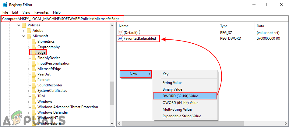 Creating the missing key - On the right side, right-click and select New > DWORD (32-bit) Value. Name this value “FavoritesBarEnabled“.