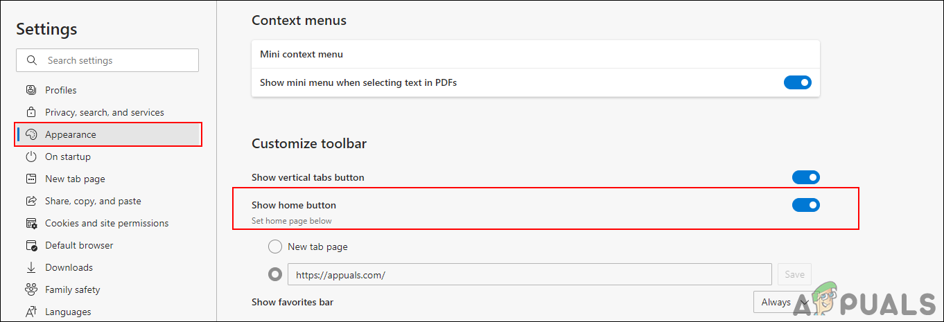 Opening Settings of the browser - Select the Appearance option from the left pane. Here, use the Show home button toggle to add or remove the Home button. When you change the toggle, you’ll notice the toolbar updates instantly.