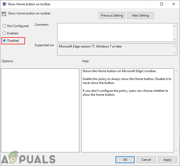Navigating to the setting - Double-click Show Home button on toolbar to open its settings. To add the Home button, set the option to Enabled. To remove it, set to Disabled.