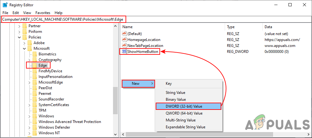 Creating the missing key - Select the Edge key. In the right pane, right-click and choose New > DWORD (32-bit) Value. Name it “ShowHomeButton“.