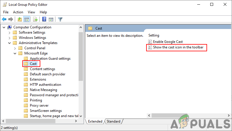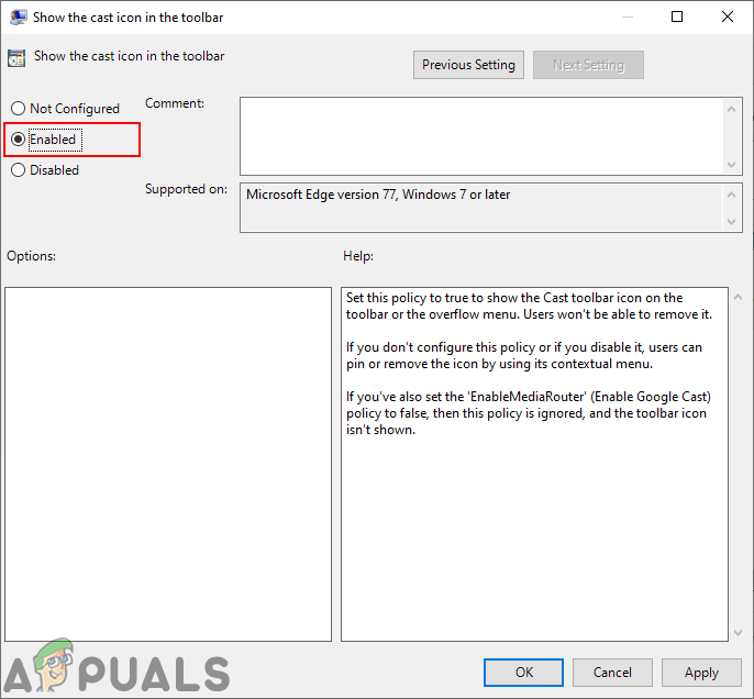 Navigating to the setting - Double-click on “Show the cast icon in the toolbar“. In the new window, select Enabled to show the Cast icon. To remove it, select Disabled.