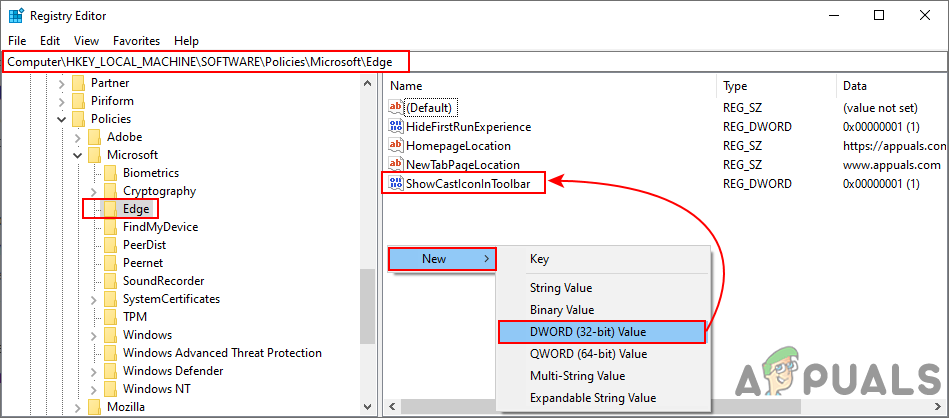 Creating the missing Edge key - Select the Edge key. In the right pane, right-click and select New > DWORD (32-bit) Value. Name it “ShowCastIconInToolbar“.