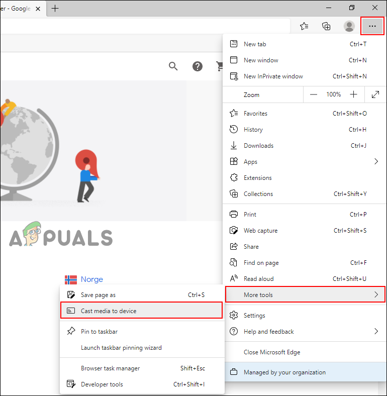 Opening Microsoft Edge - Click the Settings and more (Alt+F) button at the top right corner. Go to More tools in the menu, then click Cast media to device.