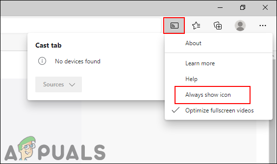 Opening Cast feature in Microsoft Edge - The Cast icon will appear in the toolbar and Edge will begin searching for compatible devices. Right-click the icon and choose Always show icon.