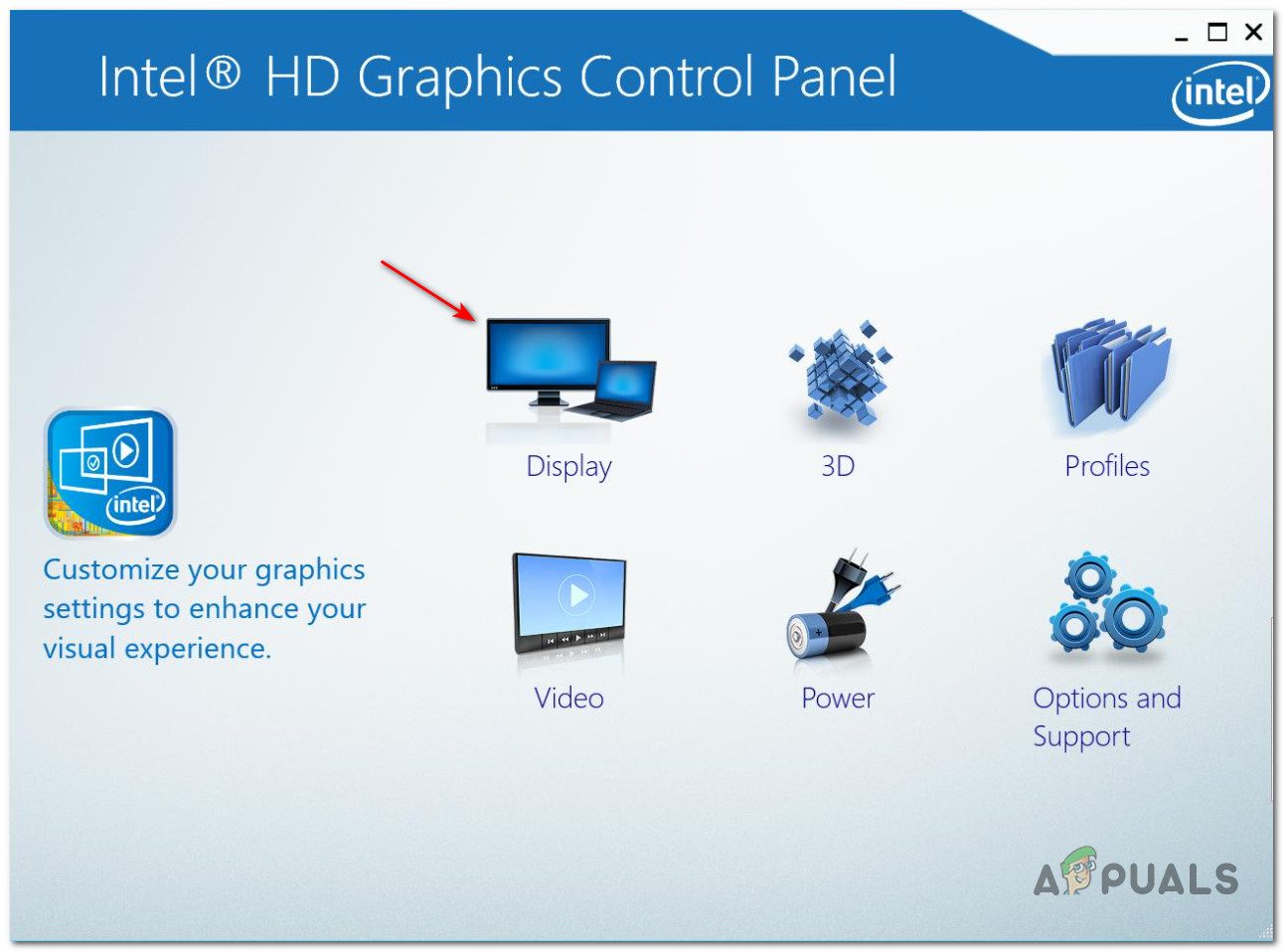 Accessing the Intel Graphics Control Panel - In the Intel Graphics Control Panel, click the Display icon (bottom left).