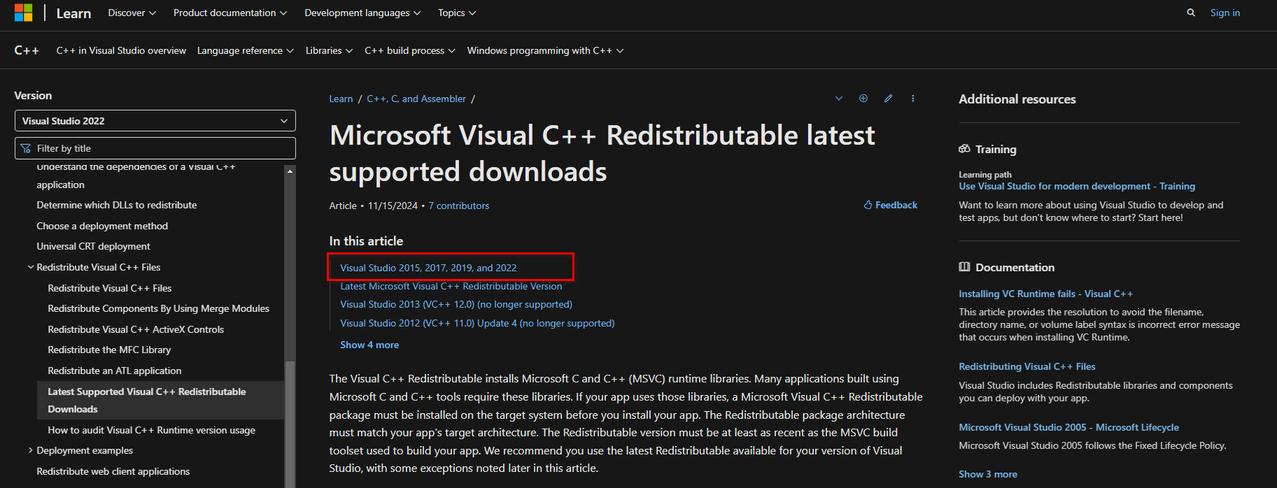 - Visit the official Microsoft Visual C++ Redistributables download page.