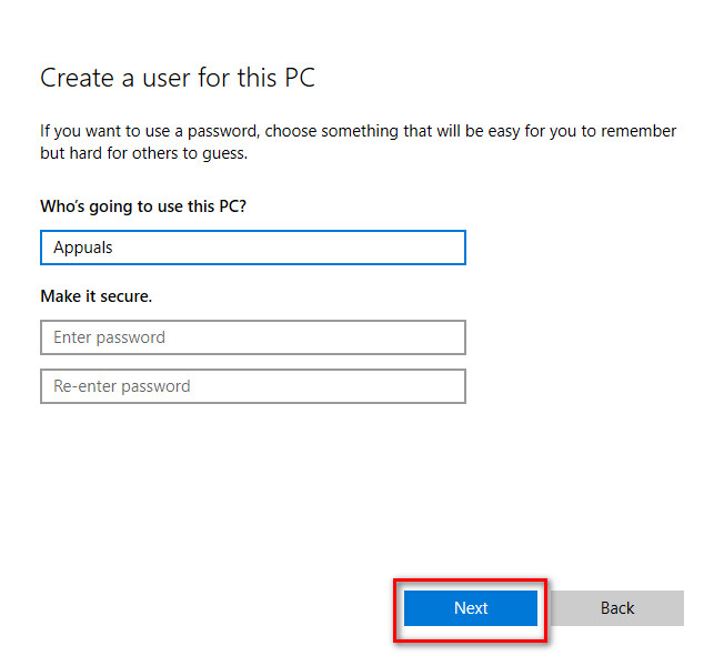 - Enter a username and password for the new account, then click Next.