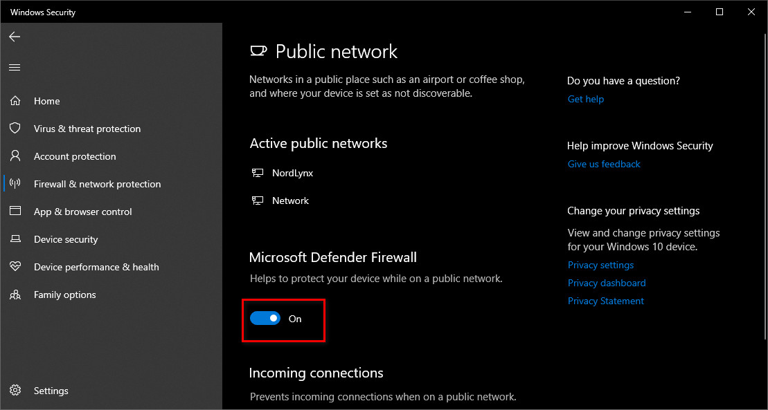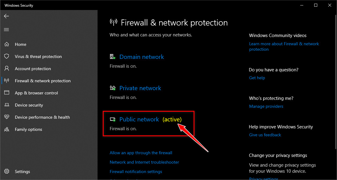 - In Firewall and network protection, click on the active Firewall profile.
