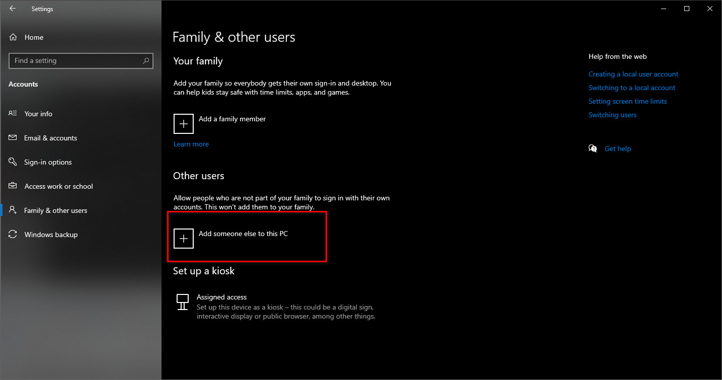 - Under Other users, click Add someone else to this PC.