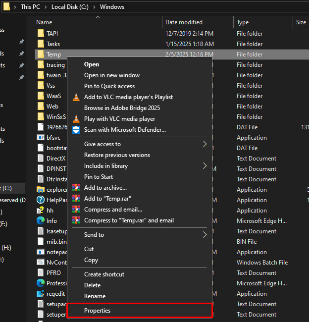 - Right-click the folder and select Properties.