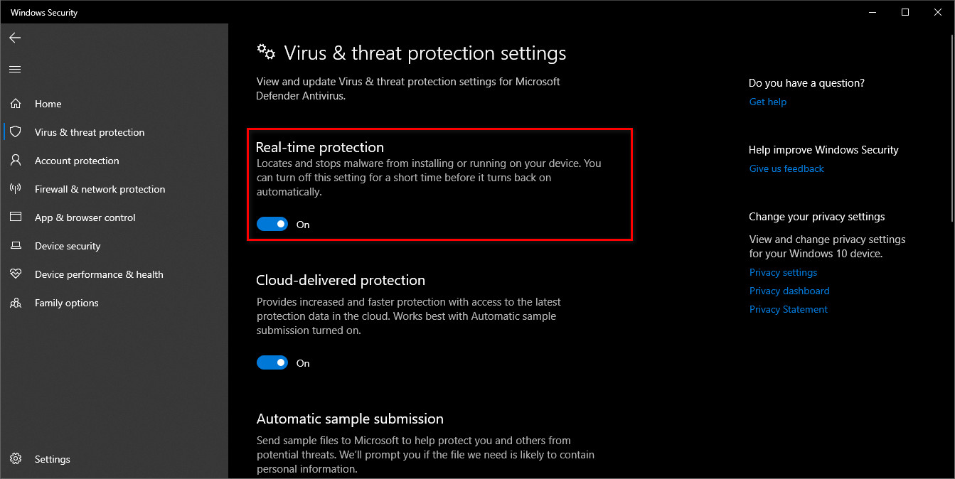 - Toggle off real-time protection.