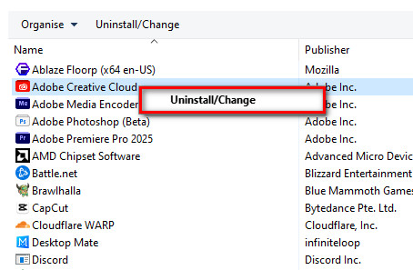- Right-click on Adobe Creative Cloud then click Uninstall/Change.