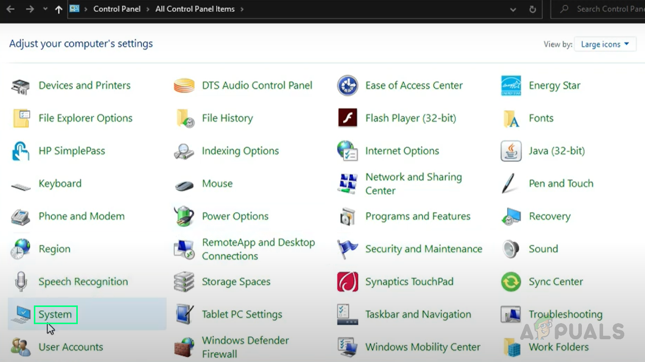 Opening Control Panel - Select System.