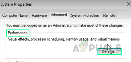 Opening Advanced System Settings - Under the Advanced tab, click on Settings under the Performance section.
