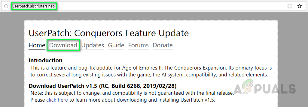 - Click Download to save the UserPatch v1.5 file on your PC from the UserPatch: Conquerors Feature Update Webpage. (This will download a zipped setup file to your Downloads folder.)
