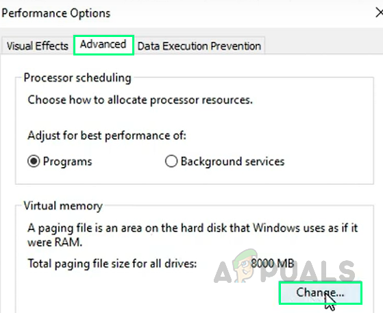 Opening Performance Settings - In the new window, click the Advanced tab and then select Change under the Virtual Memory section.