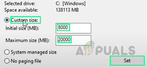 Changing Virtual Memory Settings - Set the Custom size as follows: Initial size (MB): 8000, Maximum size (MB): 20000. After entering the values, click Set.