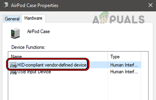 Open AirPod Case in the Unspecified Section of the Control Panel Devices - Go to the Hardware tab and double-click on HID-Compliant Device.