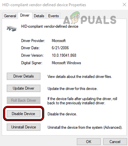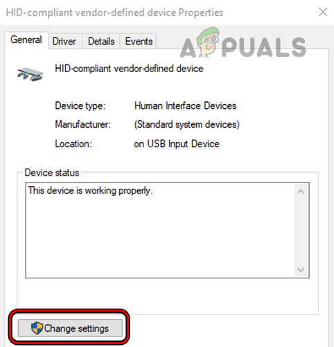 Click on the Change Settings Button in the HID-Device Compliant Device Properties - Click Disable Device and confirm when prompted.